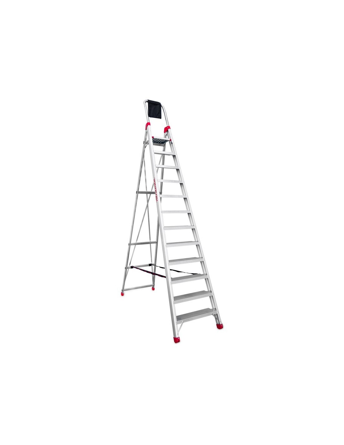 Escada de armazém profissional para uso intensivo e 12 degraus. Esta escada profissional é fabricada em alumínio e possui montantes tipo C que podem ser utilizados para fixar degraus com 130 mm de largura. Além disso, possui uma mala de ferramentas que facilitará ainda mais o seu trabalho.