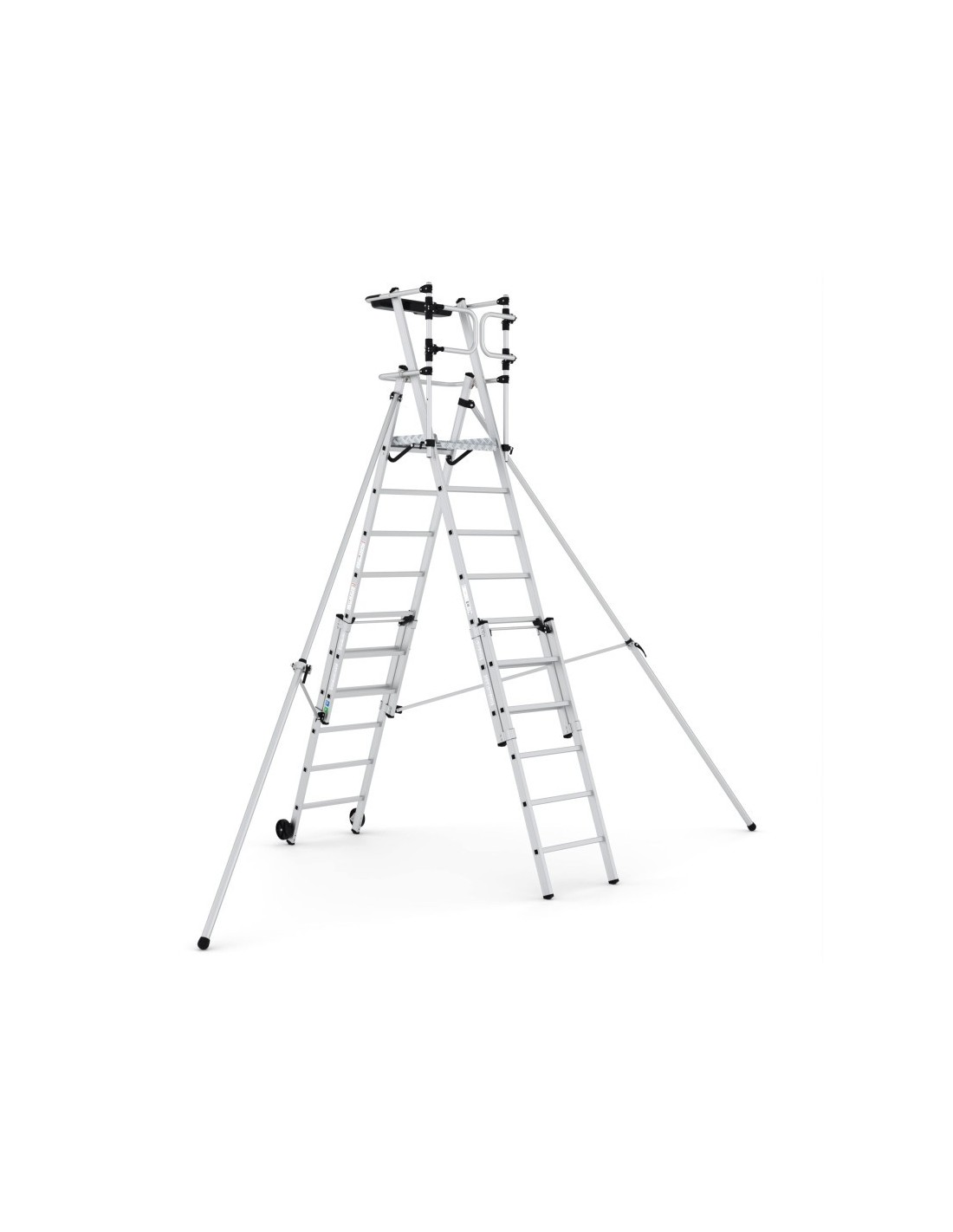 Escada profissional telescópica JANUS em alumínio para uso profissional de 7 a 10 degrauss. Esta escada profissional possui estabilizadores telescópicos que permitem ajustar a altura. A sua plataforma oferece também um espaço de trabalho confortável graças às suas dimensões (51x46 cm).