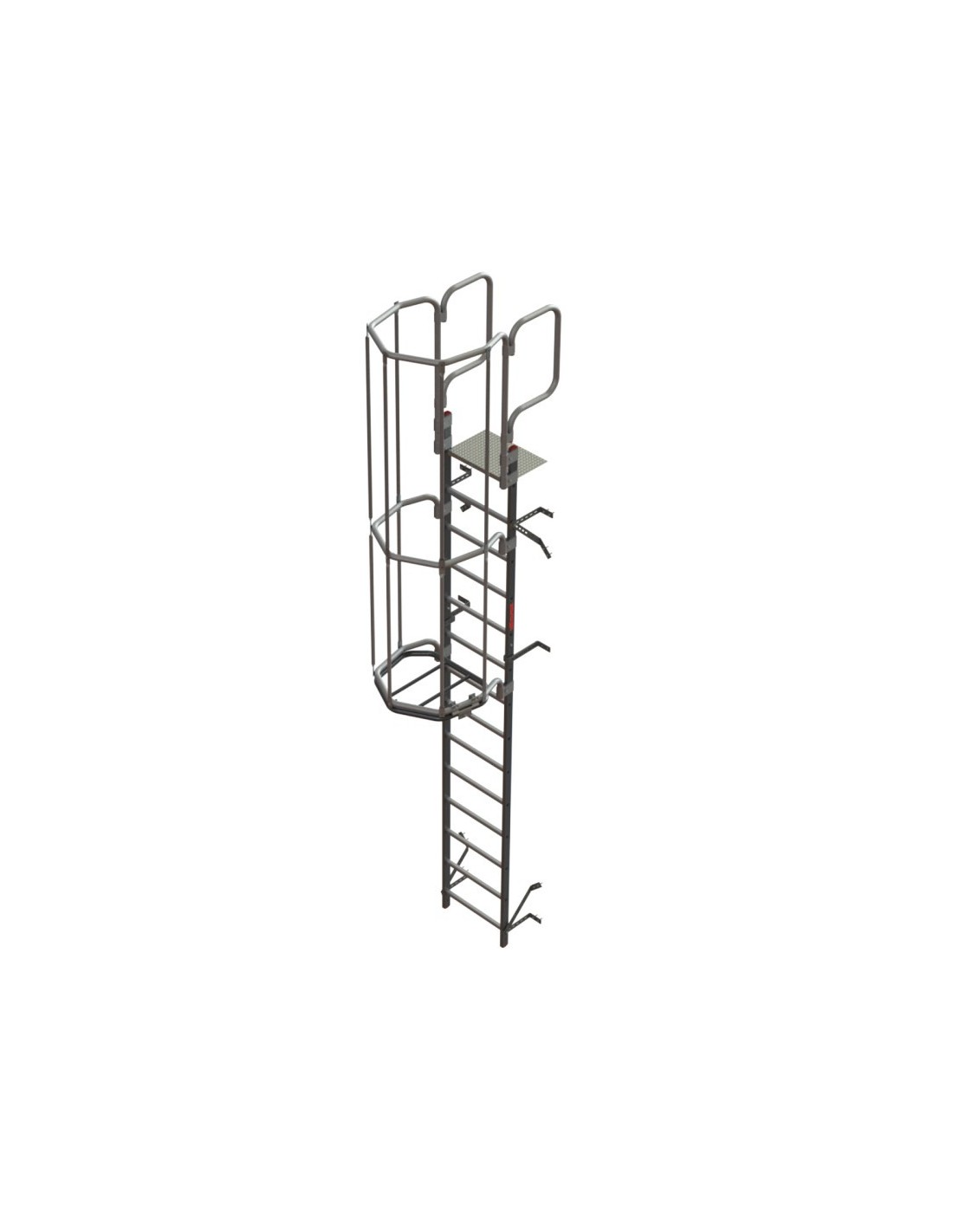 Escada de segurança vertical profissional com gaiola de proteção e patamares a cada 6 metros, de acordo com a norma EN14122-4. Escada profissional em alumínio, por isso é inoxidável. Graças ao seu fecho inferior, o acesso de pessoas estranhas e não autorizadas é facilmente evitado. Esta escada vertical é fabricada em função da altura da parede pretendida pelo cliente e, ocasionalmente, pode ser escolhida a cor das gaiolas de proteção. 3,20/3,48 Altura de parede.