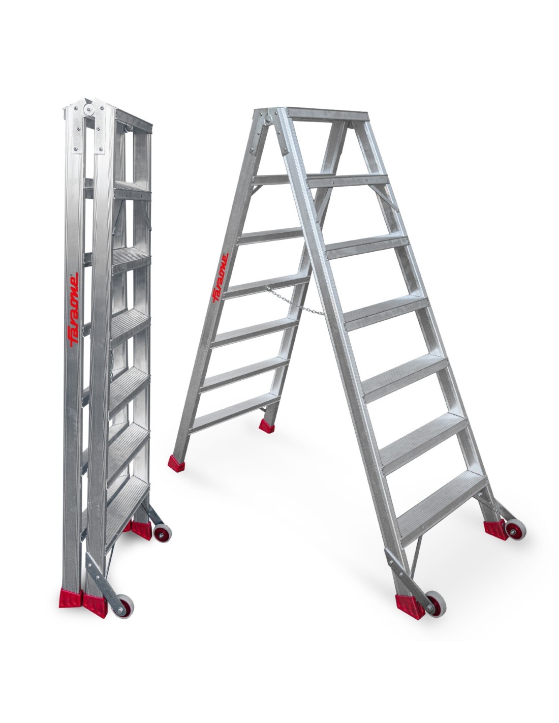 Escadote profissional com subida dupla e 7+7 degraus. Esta escada NDS é fabricada em alumínio, o que a torna resistente e leve. Além disso, possui um forte sistema de dobradiças entre as secções trepantes e um anti-fecho seguro para ganhar muito mais segurança durante os trabalhos em altura.